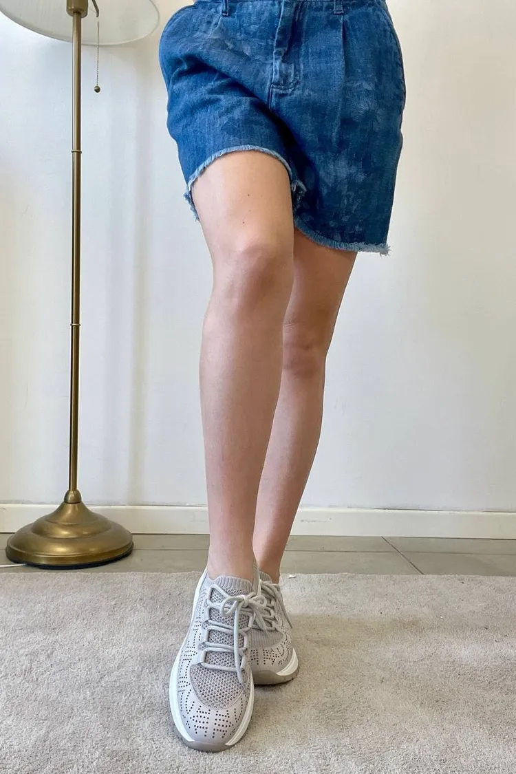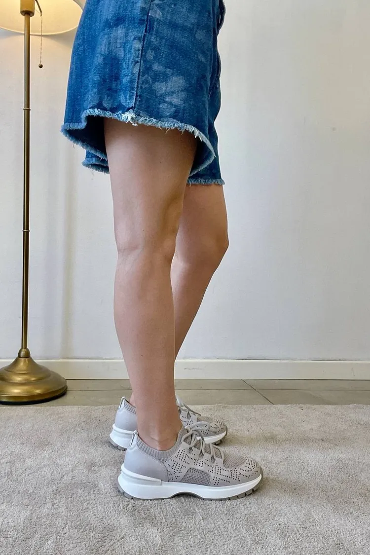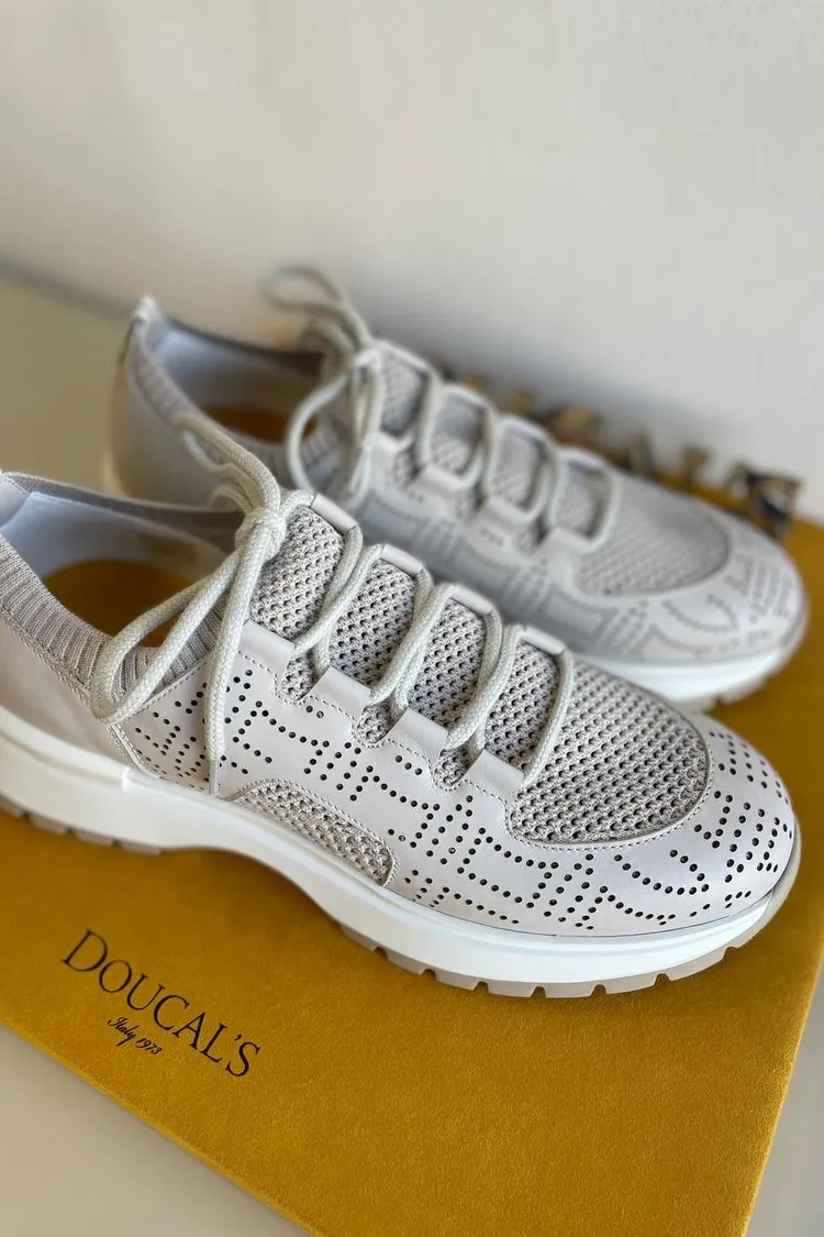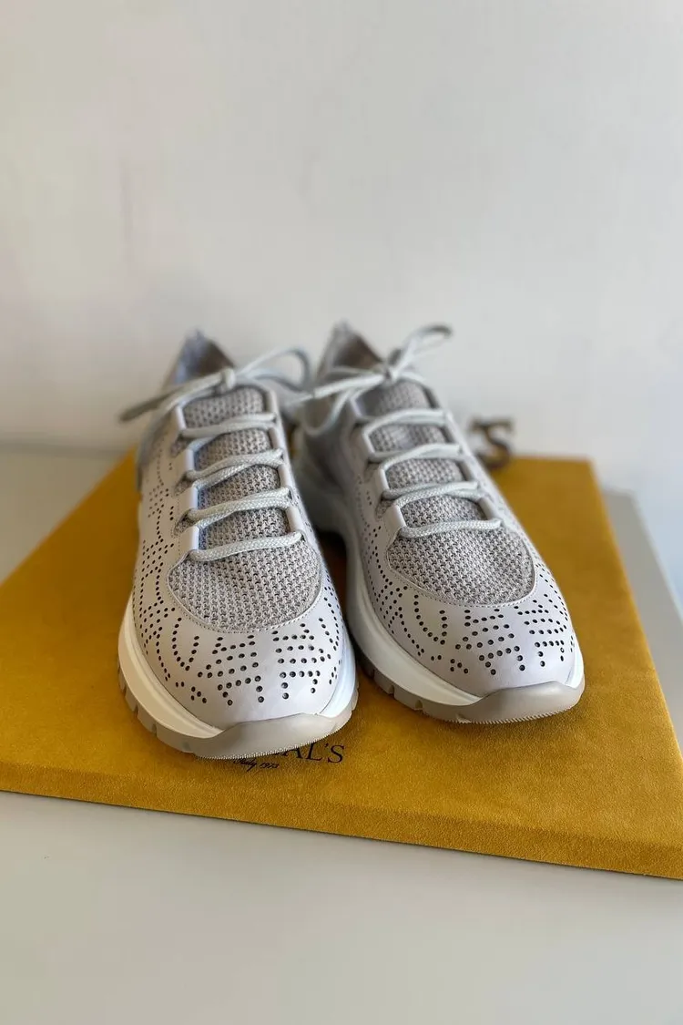 這款休閒鞋採用了優雅的淺灰色科技布料,搭配運用精緻打孔工藝製成的半小牛皮,呈現出漂亮的皮革鏤空效果