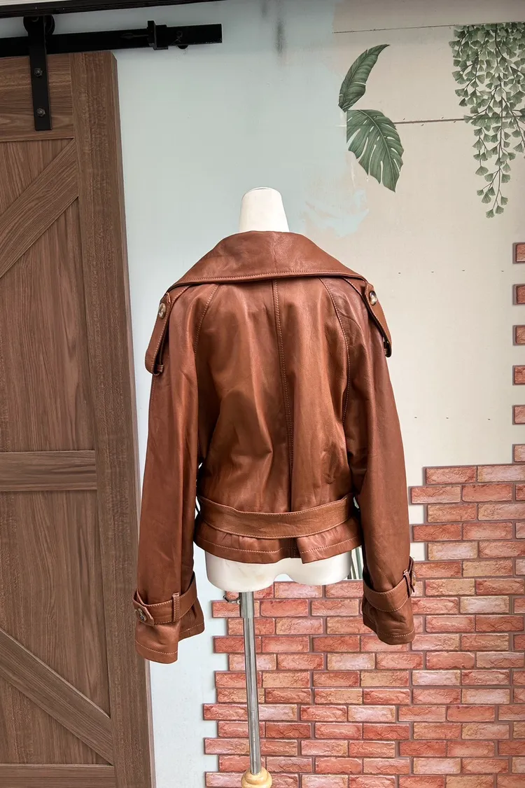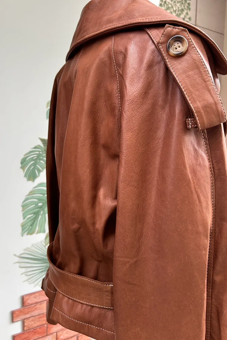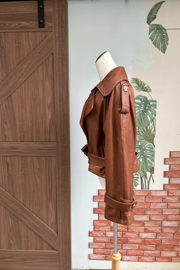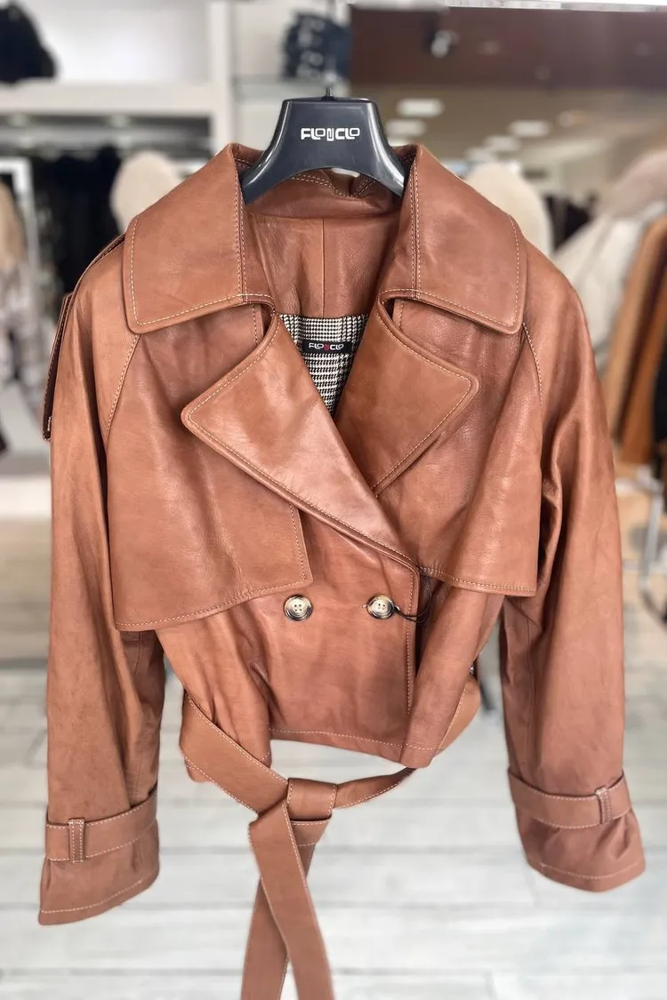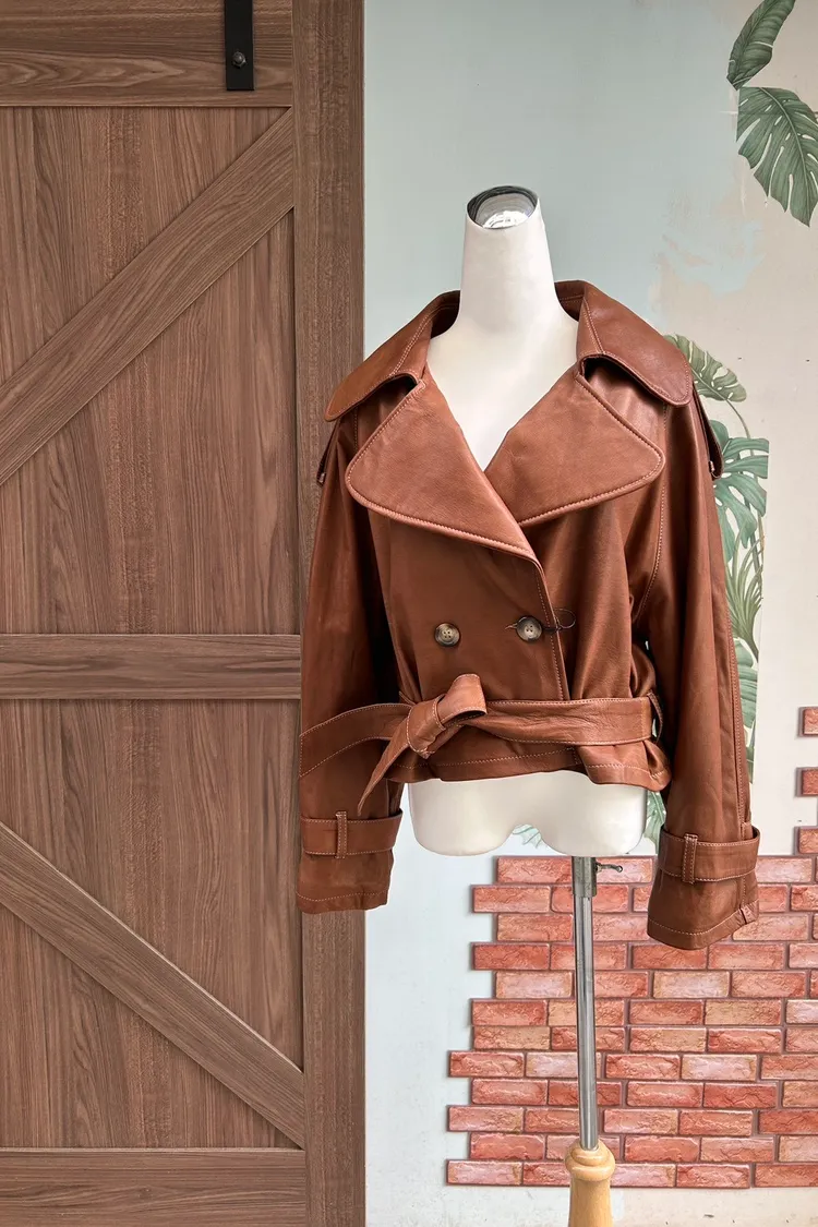 F05-義大利服飾-短版風衣款真皮外套-羊毛內裡