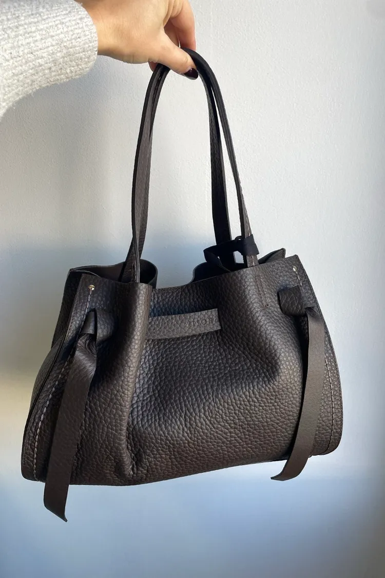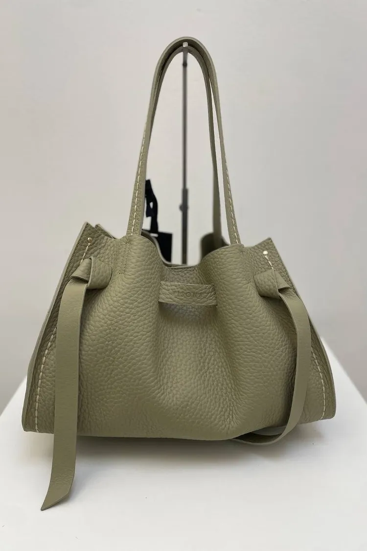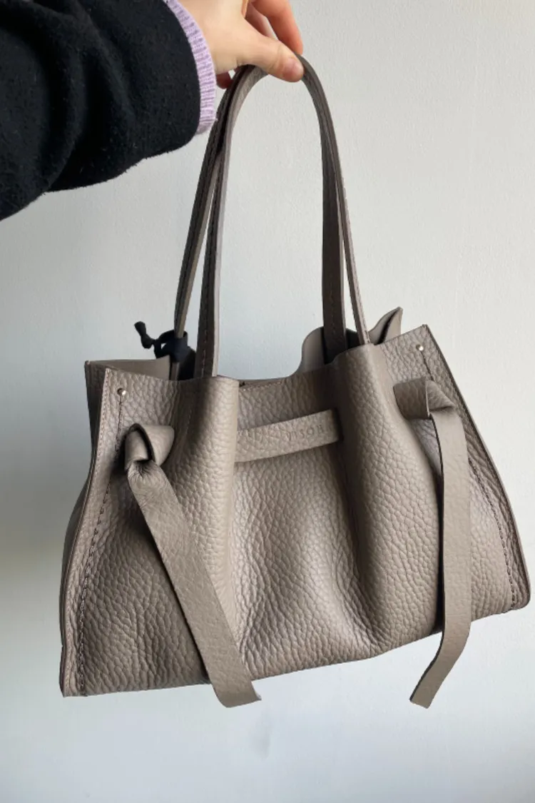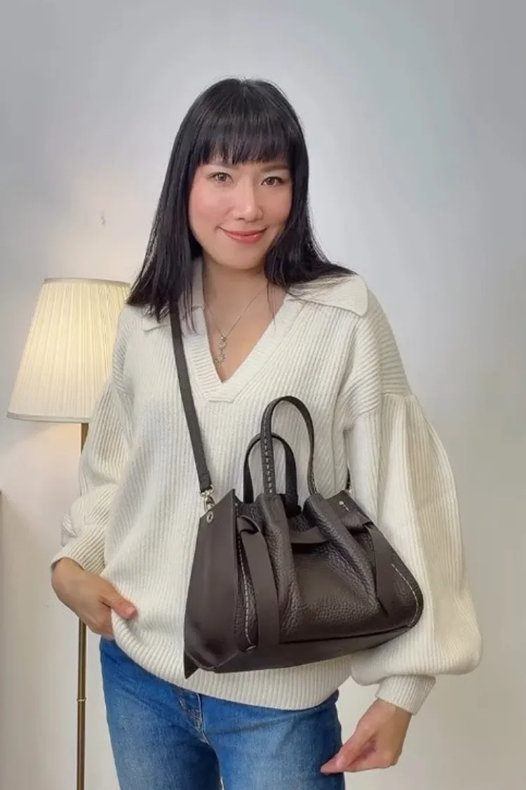 選用柔軟的雙層頭層小牛皮,呈現自然光澤與細緻觸感。包款設有可拆式肩背帶,可手提或肩背,靈活變化日常造型。
